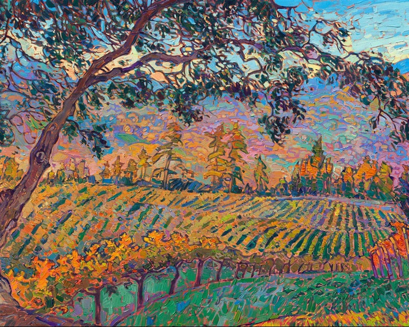 Note on varnishing: Erin’s paintings take six to eight weeks to dry, at which time we apply a retouching varnish, which allows the painting to complete the curing process while having a layer of protection against dirt and scuffs. The full curing process for an impasto oil painting takes at least two years. We are happy to assist in applying a final finishing varnish to your Erin Hanson oil painting once it has been dry for at least two years. Here is more information on how to care for your original oil painting.