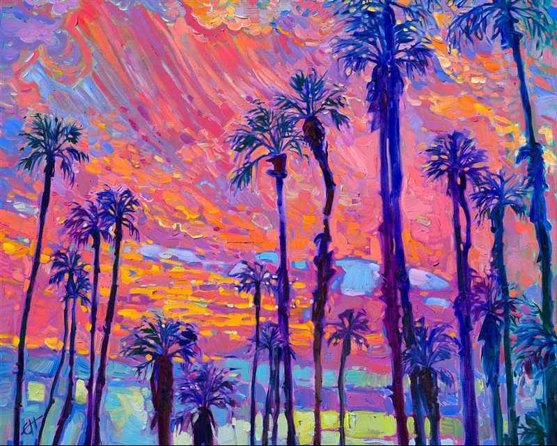 Note on varnishing: Erin’s paintings take six to eight weeks to dry, at which time we apply a retouching varnish, which allows the painting to complete the curing process while having a layer of protection against dirt and scuffs. The full curing process for an impasto oil painting takes at least two years. We are happy to assist in applying a final finishing varnish to your Erin Hanson oil painting once it has been dry for at least two years. Here is more information on how to care for your original oil painting.