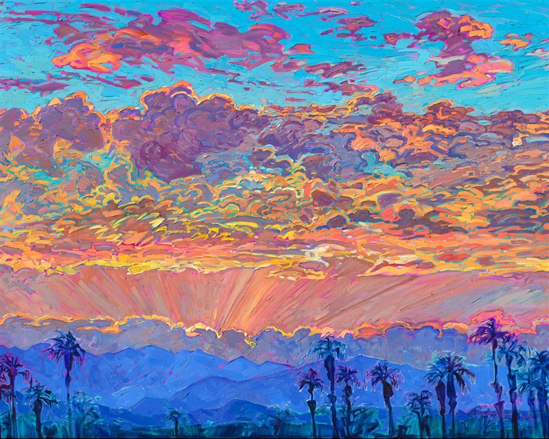 Dramatic clouds blossom with color above Palm Springs, the rays of the sun casting glimmers of yellow and gold among the mauve shadows within the clouds. The background mountains appear blue in the distance, a stark contrast against the sunset sky. The brush strokes are thick and impressionistic, capturing the fleeting beauty of the moment.