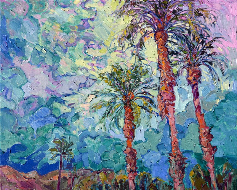 Note on varnishing: Erin’s paintings take six to eight weeks to dry, at which time we apply a retouching varnish, which allows the painting to complete the curing process while having a layer of protection against dirt and scuffs. The full curing process for an impasto oil painting takes at least two years. We are happy to assist in applying a final finishing varnish to your Erin Hanson oil painting once it has been dry for at least two years. Here is more information on how to care for your original oil painting.