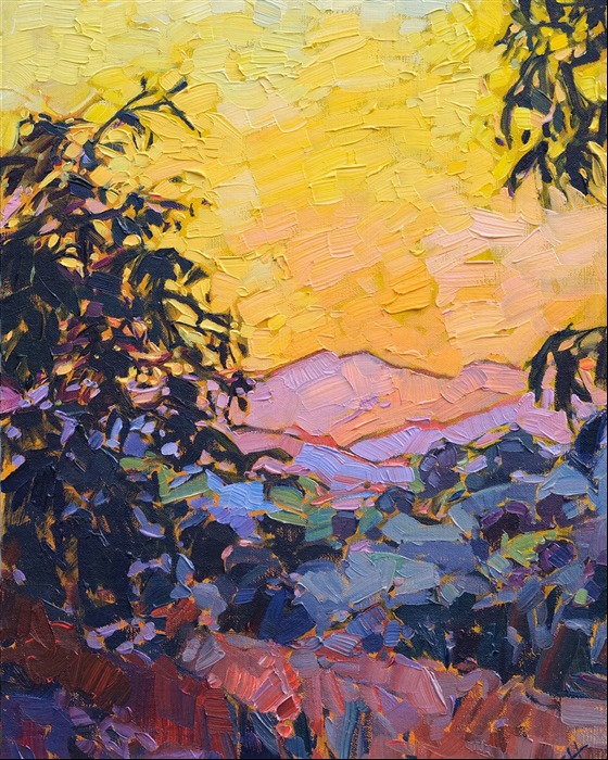 Note on varnishing: Erin’s paintings take six to eight weeks to dry, at which time we apply a retouching varnish, which allows the painting to complete the curing process while having a layer of protection against dirt and scuffs. The full curing process for an impasto oil painting takes at least two years. We are happy to assist in applying a final finishing varnish to your Erin Hanson oil painting once it has been dry for at least two years. Here is more information on how to care for your original oil painting.
