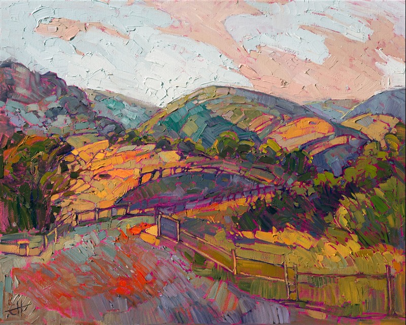 Style: "Open Impressionism" is a new style of painting developed by American artist Erin Hanson. The style is characterized by short, impasto brush strokes that are applied without layering, creating a mosaic or stained-glass appearance to the paintings. The paintings are created with a limited palette of colors, applied without blending or mixing upon the canvas, which adds a dimension of texture to each brush stroke. Inspired by classic impressionism, pointillism, and post-impressionism, Erin Hanson continues the tradition of impressionism into the modern day with her colorful and vivacious landscape paintings.