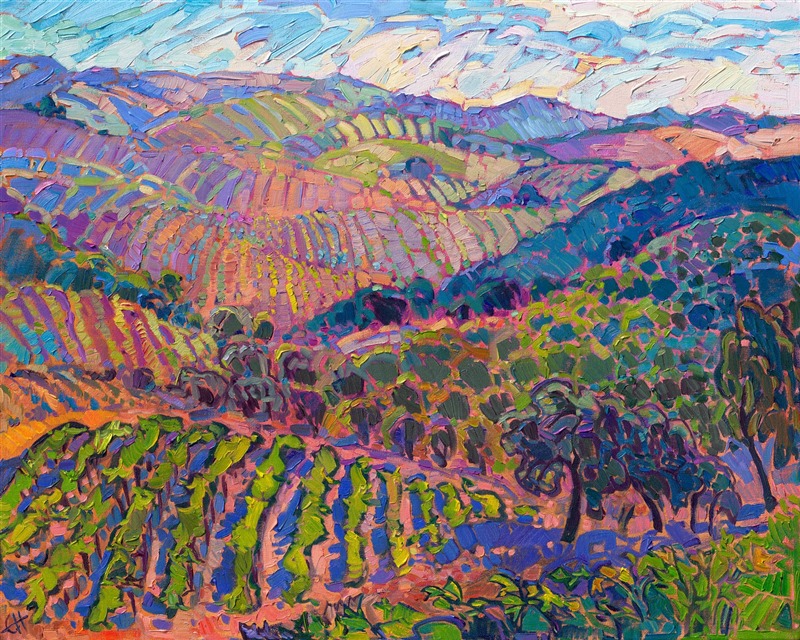 This painting of Paso Robles vines captures California wine country at its best. Perched high atop a hillside in Paso Robles, I could see far over the vineyard-covered rolling hills all around me. Laying brush strokes side by side without layering, Erin Hanson re-created the beauty and wonder of this vista in her contemporary, colorful impressionist style. This work is available for purchase as an original oil painting, 3D Textured Replica, or canvas print.
