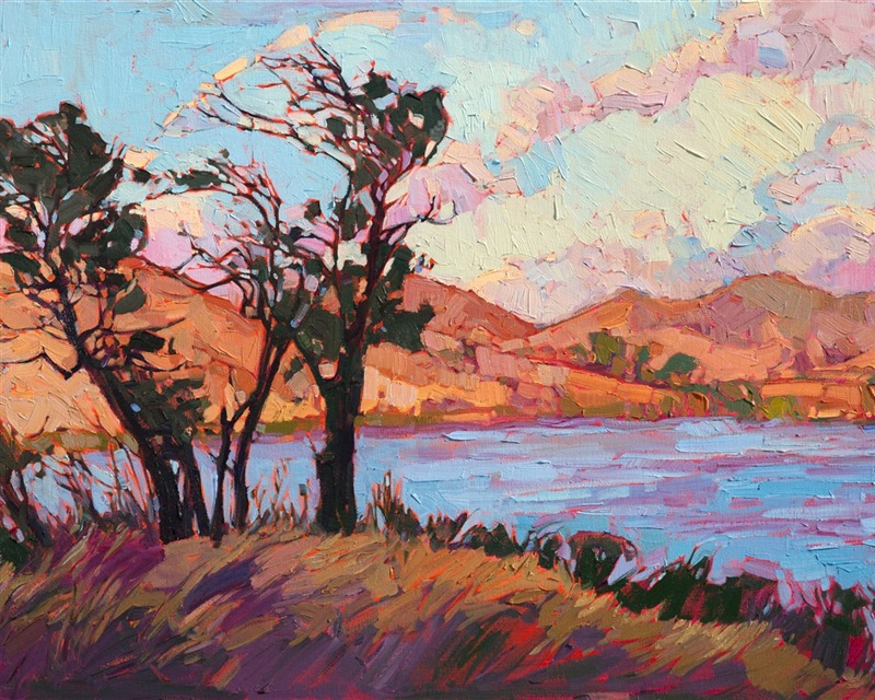 Note on varnishing: Erin’s paintings take six to eight weeks to dry, at which time we apply a retouching varnish, which allows the painting to complete the curing process while having a layer of protection against dirt and scuffs. The full curing process for an impasto oil painting takes at least two years. We are happy to assist in applying a final finishing varnish to your Erin Hanson oil painting once it has been dry for at least two years. Here is more information on how to care for your original oil painting.