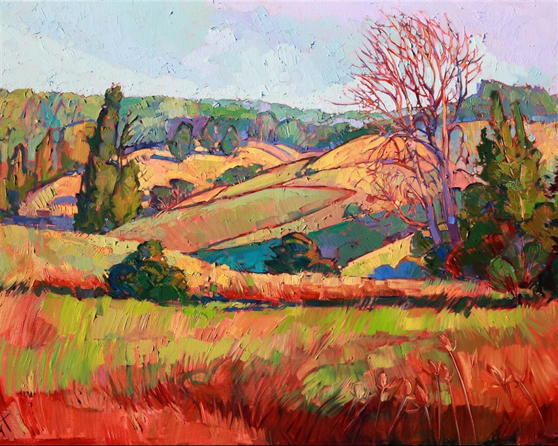 Willamette Valley is captured in California color in Erin's trademark style, open-impressionism. The brush strokes are thick and loose, full of energy and movement. The harmonious colors blend subtly or jump out with a sudden contrast, drawing the eye along through the painting.