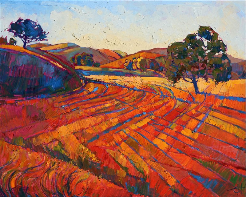 Style: "Open Impressionism" is a new style of painting developed by American artist Erin Hanson. The style is characterized by short, impasto brush strokes that are applied without layering, creating a mosaic or stained-glass appearance to the paintings. The paintings are created with a limited palette of colors, applied without blending or mixing upon the canvas, which adds a dimension of texture to each brush stroke. Inspired by classic impressionism, pointillism, and post-impressionism, Erin Hanson continues the tradition of impressionism into the modern day with her colorful and vivacious landscape paintings.