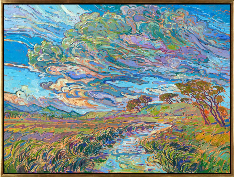 Style: "Open Impressionism" is a new style of painting developed by American artist Erin Hanson. The style is characterized by short, impasto brush strokes that are applied without layering, creating a mosaic or stained-glass appearance to the paintings. The paintings are created with a limited palette of colors, applied without blending or mixing upon the canvas, which adds a dimension of texture to each brush stroke. Inspired by classic impressionism, pointillism, and post-impressionism, Erin Hanson continues the tradition of impressionism into the modern day with her colorful and vivacious landscape paintings.