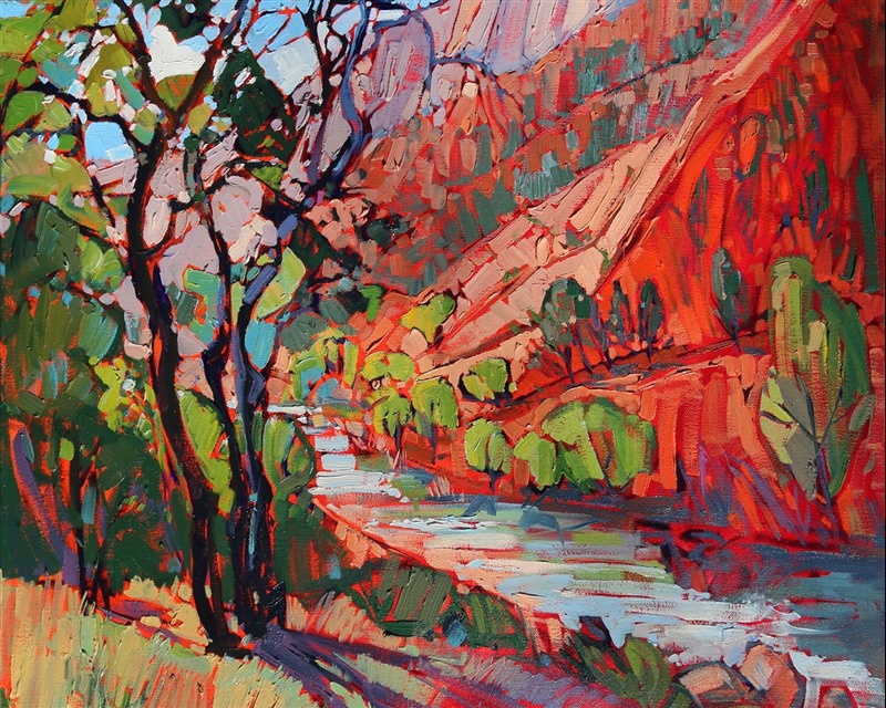 I was camping and hiking in Zion, during the month of October, hoping to see the fall colors of golden cottonwoods against the red Utah cliffs. This painting was inspired during a mid-day rest alongside the bubbling creek, listening to the water and the wind through the cottonwoods.