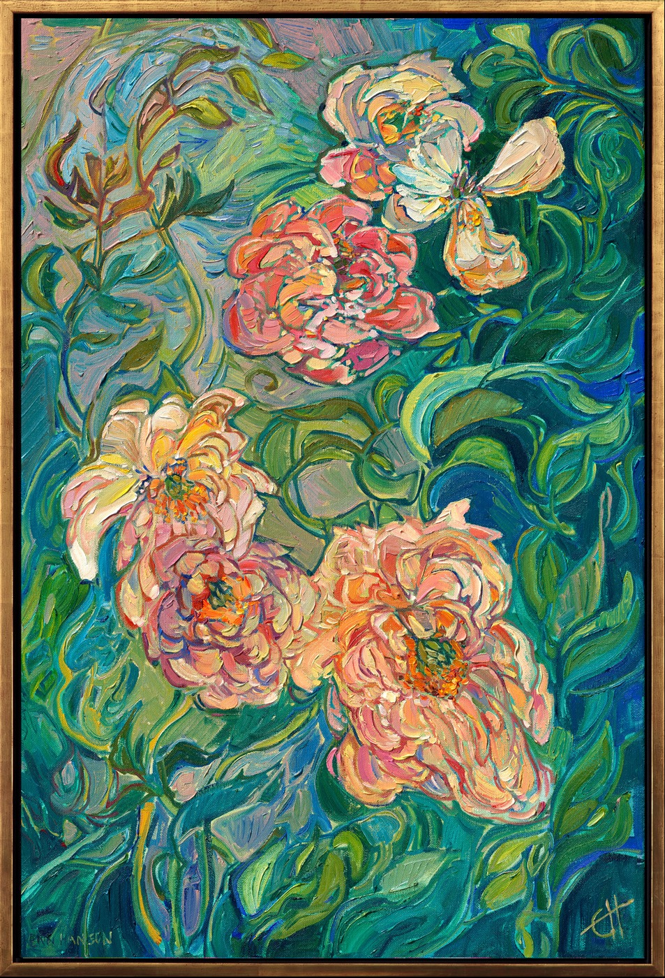 Note on varnishing: Erin’s paintings take six to eight weeks to dry, at which time we apply a retouching varnish, which allows the painting to complete the curing process while having a layer of protection against dirt and scuffs. The full curing process for an impasto oil painting takes at least two years. We are happy to assist in applying a final finishing varnish to your Erin Hanson oil painting once it has been dry for at least two years. Here is more information on how to care for your original oil painting.