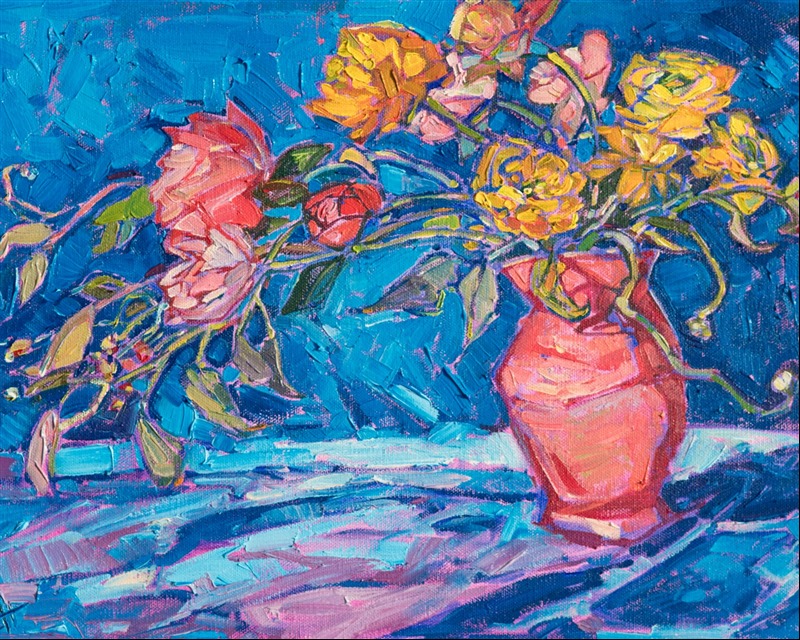 A vase of peonies and ranunculus inspired this oil painting. The bright, contrasting colors and abstract shapes are captured in impressionistic, painterly brush strokes.