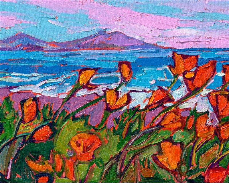 A flurry of orange poppies caught my attention growing along Highway 1 in California. The bright canary blooms seemed to vibrate with color against the aqua blue backdrop of the Pacific Ocean. Thick, impasto brush strokes capture the movement and life of the scene.