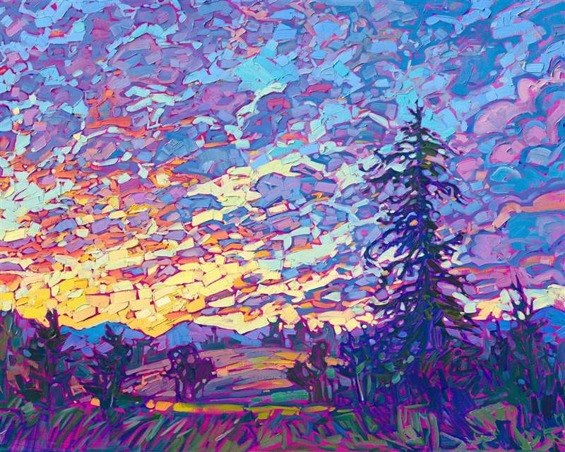 Style: "Open Impressionism" is a new style of painting developed by American artist Erin Hanson. The style is characterized by short, impasto brush strokes that are applied without layering, creating a mosaic or stained-glass appearance to the paintings. The paintings are created with a limited palette of colors, applied without blending or mixing upon the canvas, which adds a dimension of texture to each brush stroke. Inspired by classic impressionism, pointillism, and post-impressionism, Erin Hanson continues the tradition of impressionism into the modern day with her colorful and vivacious landscape paintings.