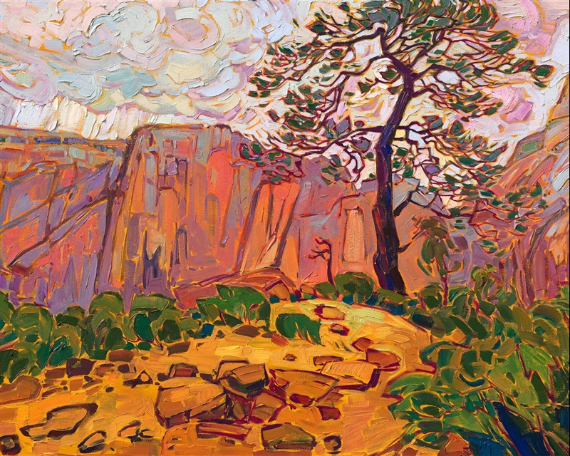 "Pine at Angel's Landing" was created on gallery-depth canvas, with the painting continued around the edges. The piece arrives framed in a contemporary gold floater frame.
