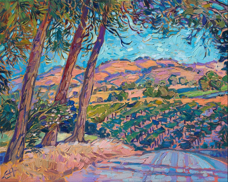 Driving through the winding roads of Paso Robles never fails to inspire me to paint... I love sunrise and sunset the best, when the summer-burnt hills turn hues of raspberry and orange sherbet. The curving rows of vineyards draw you into the painting, while the overhanging redwoods frame the piece, making it feel secluded and personal.