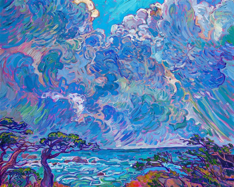 Point Lobos State Park is captured in hues of cobalt and ultramarine. Large clouds fill the sky, towering into the heavens. Monterey cypress trees cling to the rocky shoreline, drinking in the sea-laden air. Thick brush strokes of oil paint laid side by side make the painting come alive with texture and movement.