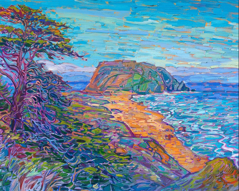 "Point Sur Vista" is an original oil painting by American impressionist Erin Hanson. The painting arrives framed in a floater frame finished in burnished, 23kt gold leaf.