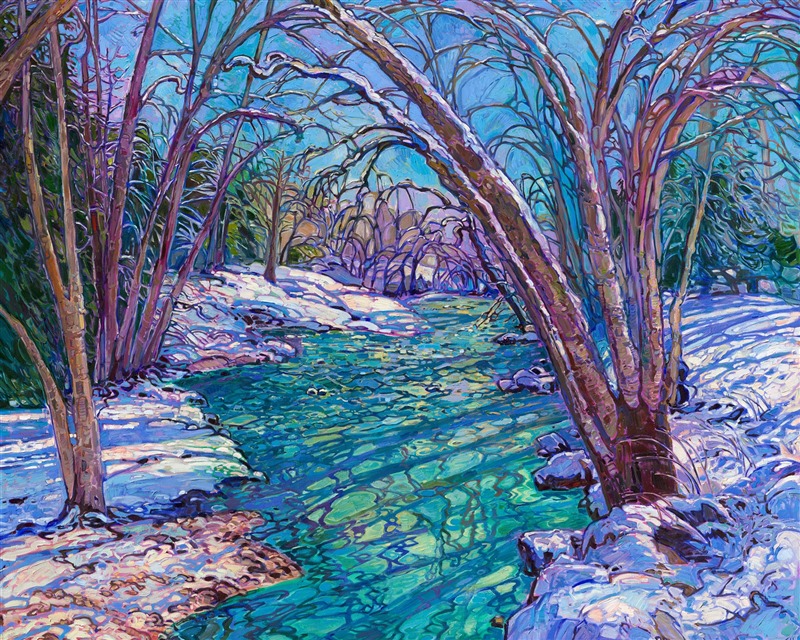 Long shadows drape patterns of light and dark across the snow-covered earth and still river bed. Hanging tree boughs leave waving reflections in the water that look like tiles of stained glass. This painting captures the tranquil beauty of winter.