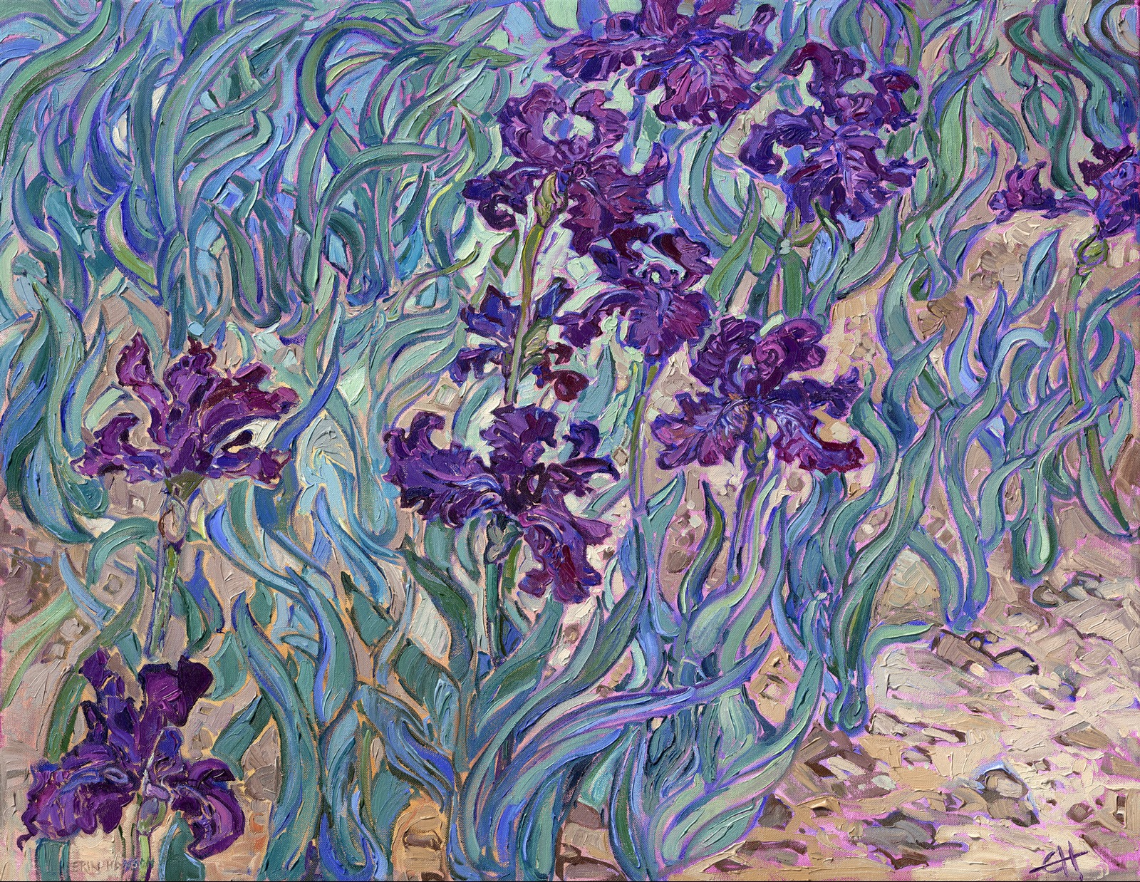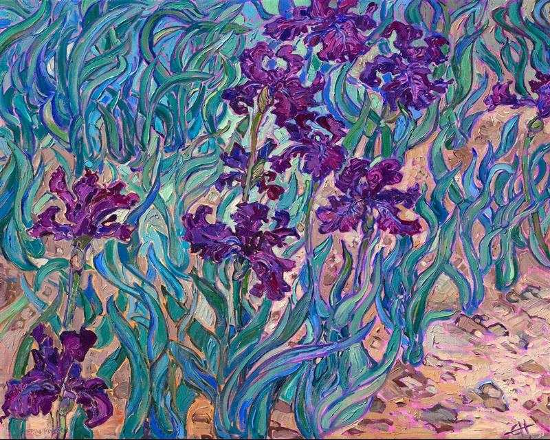 Note on varnishing: Erin’s paintings take six to eight weeks to dry, at which time we apply a retouching varnish, which allows the painting to complete the curing process while having a layer of protection against dirt and scuffs. The full curing process for an impasto oil painting takes at least two years. We are happy to assist in applying a final finishing varnish to your Erin Hanson oil painting once it has been dry for at least two years. Here is more information on how to care for your original oil painting.