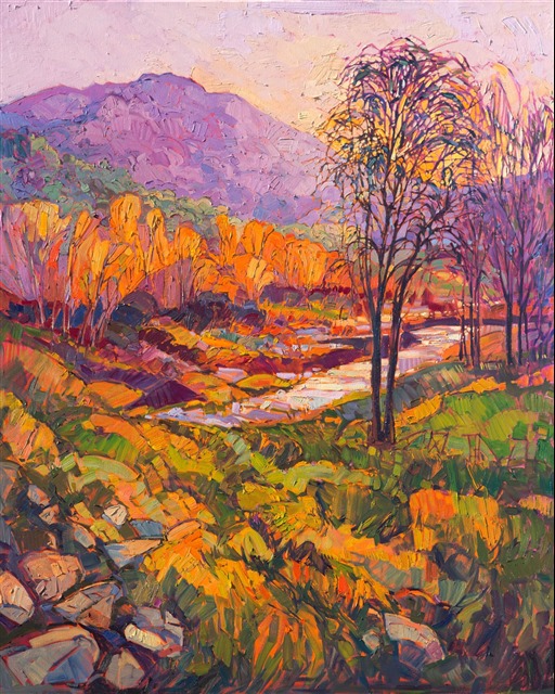 Style: "Open Impressionism" is a new style of painting developed by American artist Erin Hanson. The style is characterized by short, impasto brush strokes that are applied without layering, creating a mosaic or stained-glass appearance to the paintings. The paintings are created with a limited palette of colors, applied without blending or mixing upon the canvas, which adds a dimension of texture to each brush stroke. Inspired by classic impressionism, pointillism, and post-impressionism, Erin Hanson continues the tradition of impressionism into the modern day with her colorful and vivacious landscape paintings.