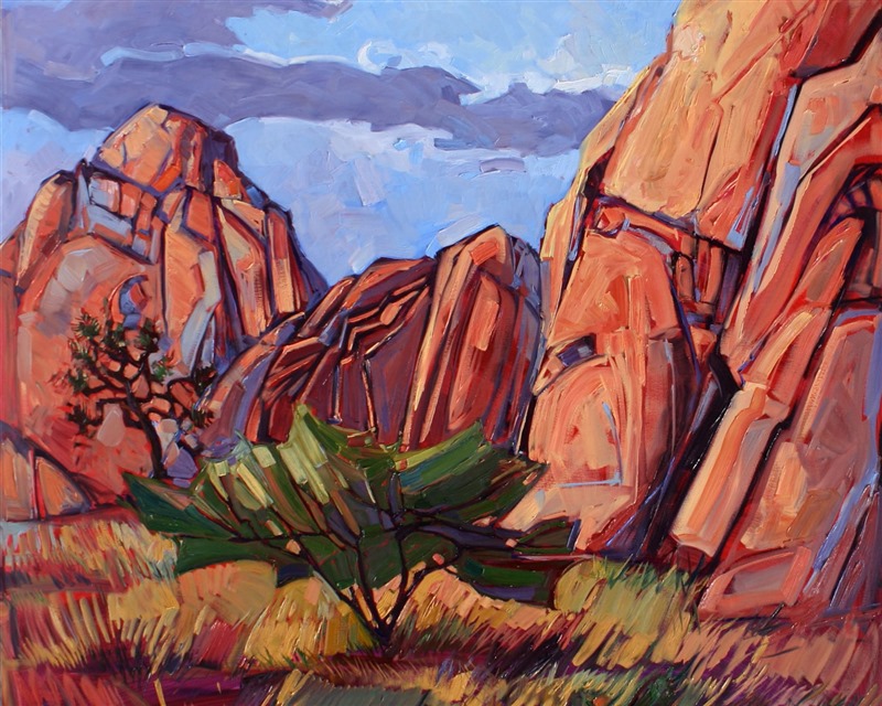 ERIN HANSON has been painting in oils since she was 8 years old. As a teenager, she apprenticed at a mural studio where she worked on 40-foot-long paintings while selling art commissions on the side. After being told it was too hard to make a living as an artist, she got her degree in Bioengineering from UC Berkeley. Afterward, Erin became a rock climber at Red Rock Canyon, Nevada. Inspired by the colorful scenery she was climbing, she decided to return to her love of painting and create one new painting every week.