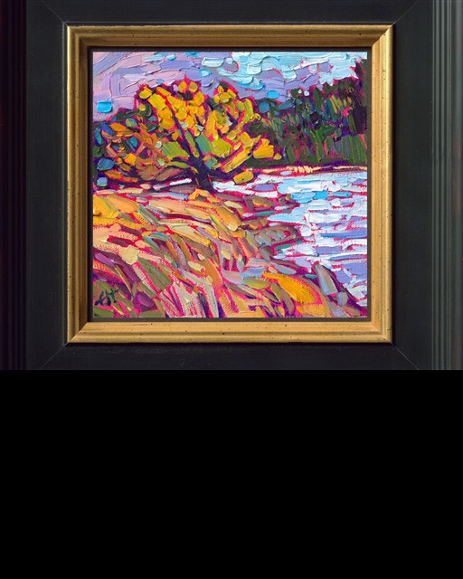 Note on varnishing: Erin’s paintings take six to eight weeks to dry, at which time we apply a retouching varnish, which allows the painting to complete the curing process while having a layer of protection against dirt and scuffs. The full curing process for an impasto oil painting takes at least two years. We are happy to assist in applying a final finishing varnish to your Erin Hanson oil painting once it has been dry for at least two years. Here is more information on how to care for your original oil painting.