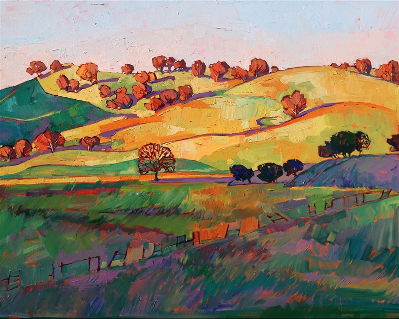 This painting perfectly captures the smooth rolling hills of central California, dotted with idyllic rounded oak trees. The shadows are rich shades of purple and aqua green, contrasting against the brilliant colors of sunrise.