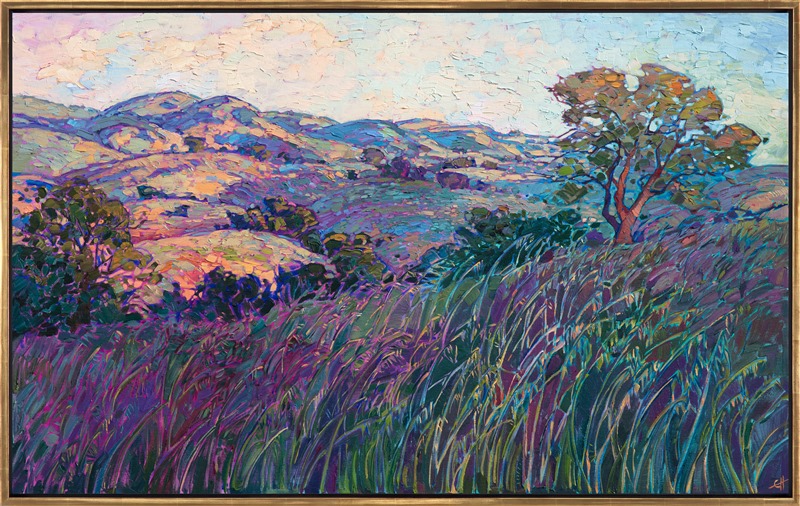 The long, rolling grasses of Paso Robles are captured here in vibrant color and thick brush strokes, bringing the beauty of central California to life on the canvas. The painting has almost a dream-like quality and invites you to go wandering through the idyllic, grassy hillsides.