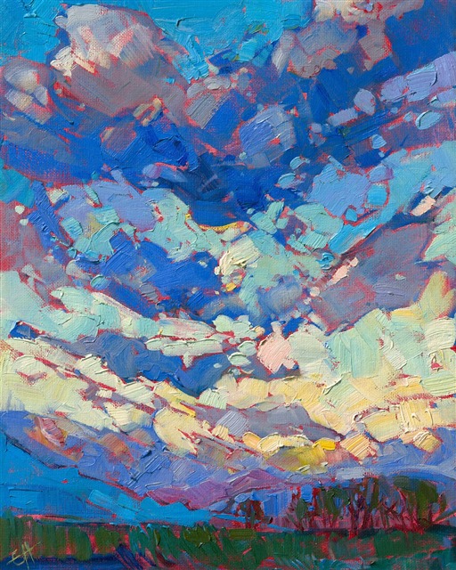 Note on varnishing: Erin’s paintings take six to eight weeks to dry, at which time we apply a retouching varnish, which allows the painting to complete the curing process while having a layer of protection against dirt and scuffs. The full curing process for an impasto oil painting takes at least two years. We are happy to assist in applying a final finishing varnish to your Erin Hanson oil painting once it has been dry for at least two years. Here is more information on how to care for your original oil painting.