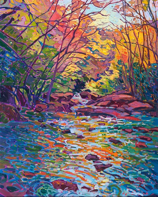 "Running Reflections" is an original oil painting created in Erin Hanson's unique Open Impressionism style, with thick, expressive brush strokes that are laid side-by-side on the canvas without blending. The piece arrives framed in a contemporary gold floater frame, ready to hang.