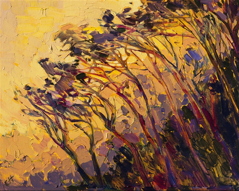Saffron shades of light complement the hazy purple hills and coastal trees. The mosaic pattern of light has an almost stained glass look. Each brush stroke is alive with color and texture.