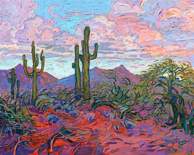 Note on varnishing: Erin’s paintings take six to eight weeks to dry, at which time we apply a retouching varnish, which allows the painting to complete the curing process while having a layer of protection against dirt and scuffs. The full curing process for an impasto oil painting takes at least two years. We are happy to assist in applying a final finishing varnish to your Erin Hanson oil painting once it has been dry for at least two years. Here is more information on how to care for your original oil painting.