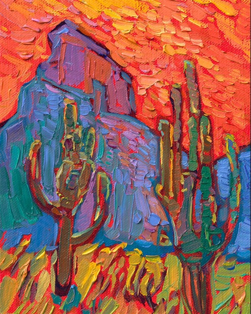 "Saguaro Peak" is an original oil painting on linen board. This piece arrives framed in a custom-made plein air frame (mock floater style, so the edges are uncovered). This painting will be displayed at The Erin Hanson Gallery in McMinnville as part of her annual Petite Show.