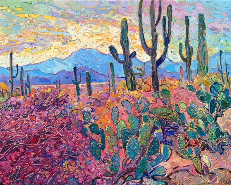 Framing: "Saguaro Scrub" is an original oil painting created in Erin Hanson's Open Impressionism style. The original arrives framed and ready to hang in a wooden floater frame finished in 23kt gold leaf.