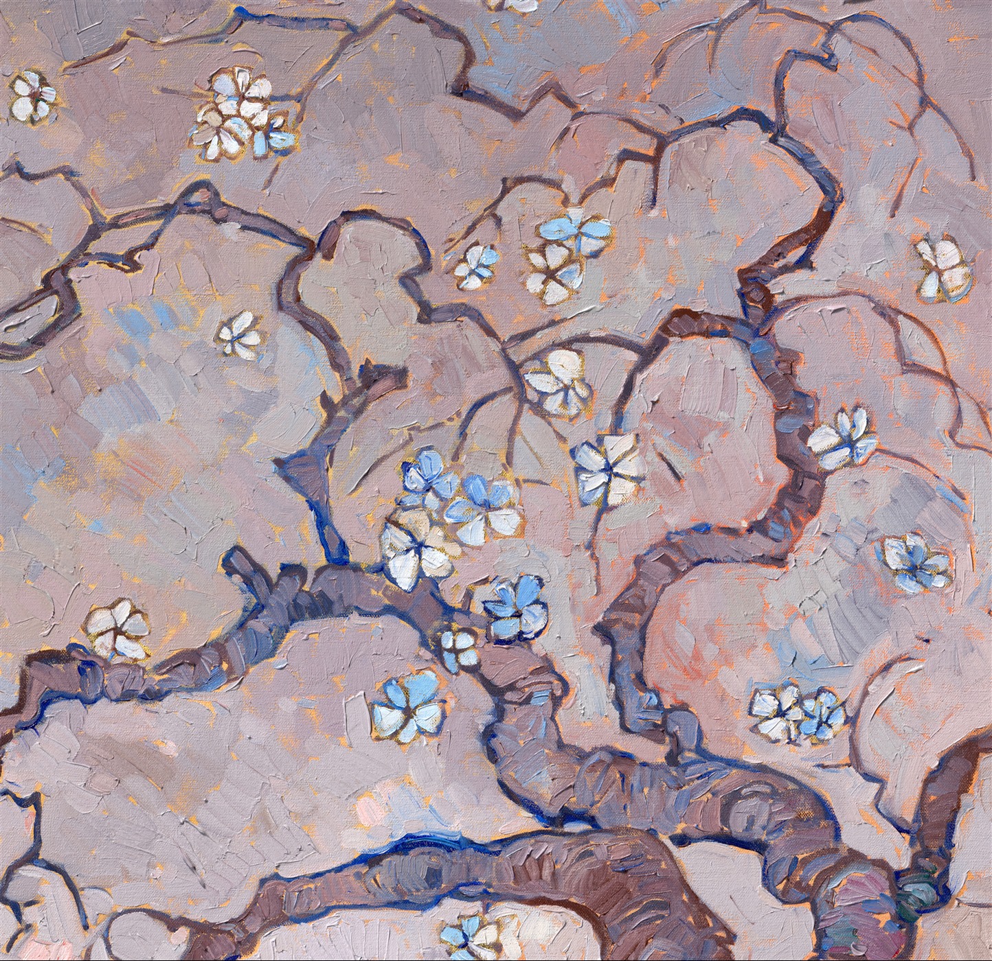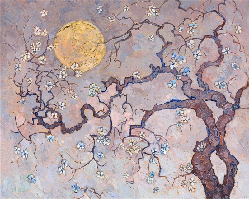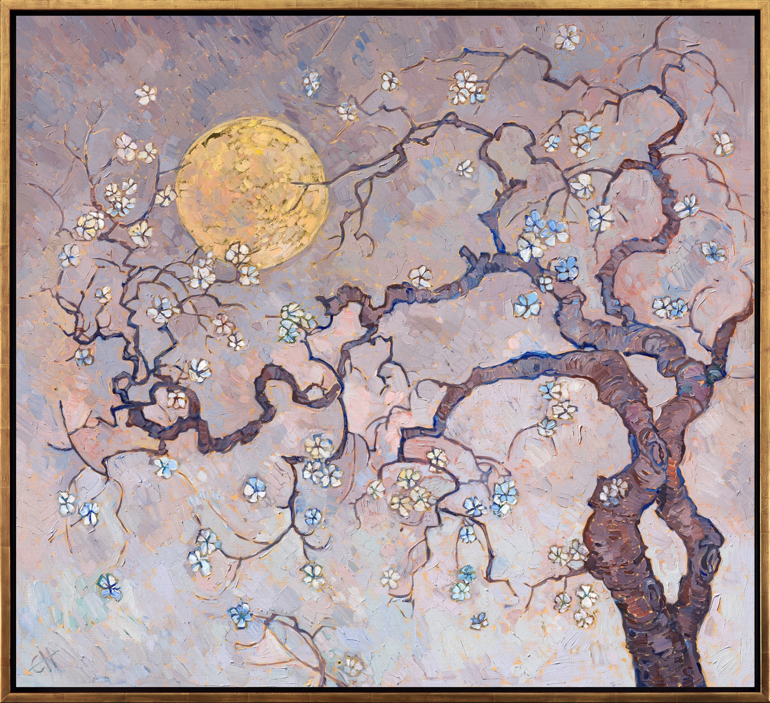 "Sakura Moon" was painted over 24kt gold leaf. The gold glints through the paint strokes on the moon and between the cherry blossoms. The subtle glimmer effect can be seen when you move around the painting and see it from different directions.