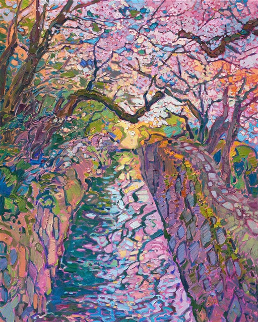 The Philosopher's Path in Kyoto, Japan, is a winding path of stepping stones next to a cobblestone-lined streambed. This painting captures the beauty of cherry blossoms ("sakura" in Japanese) with thick, impressionistic brushstrokes and expressive color.