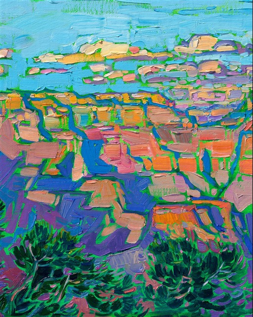 Style: "Open Impressionism" is a new style of painting developed by American artist Erin Hanson. The style is characterized by short, impasto brush strokes that are applied without layering, creating a mosaic or stained-glass appearance to the paintings. The paintings are created with a limited palette of colors, applied without blending or mixing upon the canvas, which adds a dimension of texture to each brush stroke. Inspired by classic impressionism, pointillism, and post-impressionism, Erin Hanson continues the tradition of impressionism into the modern day with her colorful and vivacious landscape paintings.