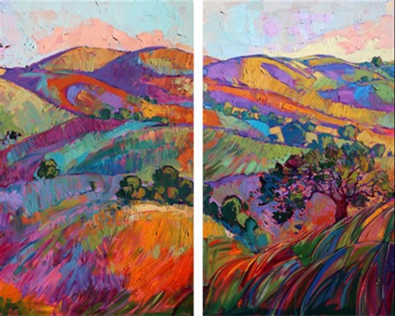 Style: "Open Impressionism" is a new style of painting developed by American artist Erin Hanson. The style is characterized by short, impasto brush strokes that are applied without layering, creating a mosaic or stained-glass appearance to the paintings. The paintings are created with a limited palette of colors, applied without blending or mixing upon the canvas, which adds a dimension of texture to each brush stroke. Inspired by classic impressionism, pointillism, and post-impressionism, Erin Hanson continues the tradition of impressionism into the modern day with her colorful and vivacious landscape paintings.