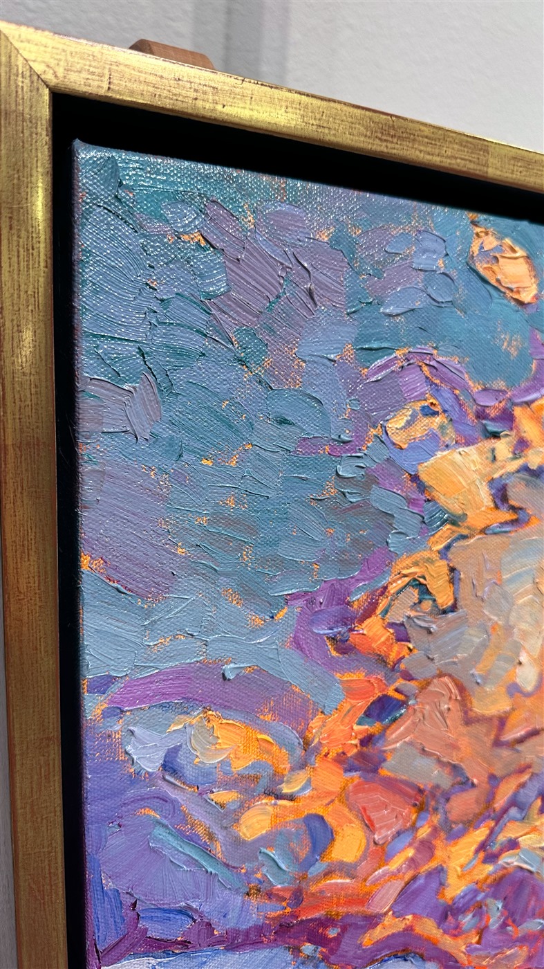 This painting was done on 1-1/2" canvas, with the painting continuing around the edges. The painting will be framed in a 23kt gold leaf floater frame to complement the colors in the piece. It arrives wired and ready to hang.