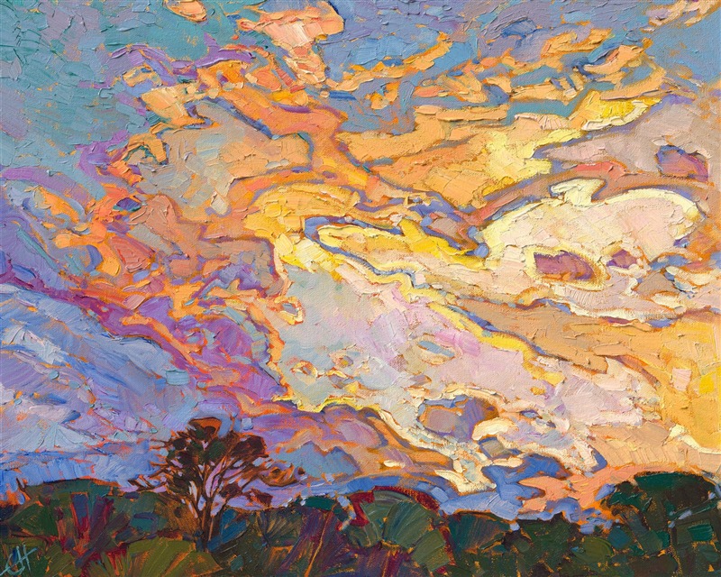 Note on varnishing: Erin’s paintings take six to eight weeks to dry, at which time we apply a retouching varnish, which allows the painting to complete the curing process while having a layer of protection against dirt and scuffs. The full curing process for an impasto oil painting takes at least two years. We are happy to assist in applying a final finishing varnish to your Erin Hanson oil painting once it has been dry for at least two years. Here is more information on how to care for your original oil painting.