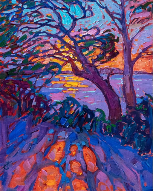 Note on varnishing: Erin’s paintings take six to eight weeks to dry, at which time we apply a retouching varnish, which allows the painting to complete the curing process while having a layer of protection against dirt and scuffs. The full curing process for an impasto oil painting takes at least two years. We are happy to assist in applying a final finishing varnish to your Erin Hanson oil painting once it has been dry for at least two years. Here is more information on how to care for your original oil painting.