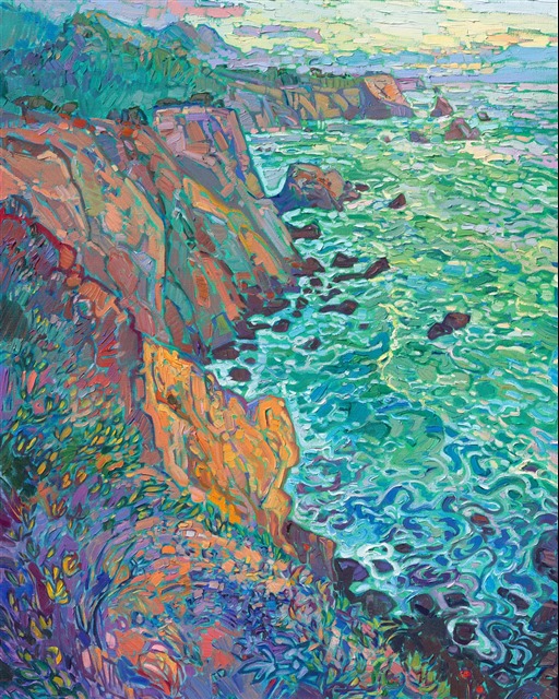 Looking southward from a high bluff in Mendocino County, I watch crashing waves and swirling turquoise waters as far as I can see. The rocky coastline of Northern California, dotted with sea stacks and steep cliffs, is a landscape painter's dream. I used a limited palette of five colors to capture the rich hues of this coastal scene. I try not to overlap my brush strokes when I paint, which gives my brush strokes a highly textured, painterly feel.