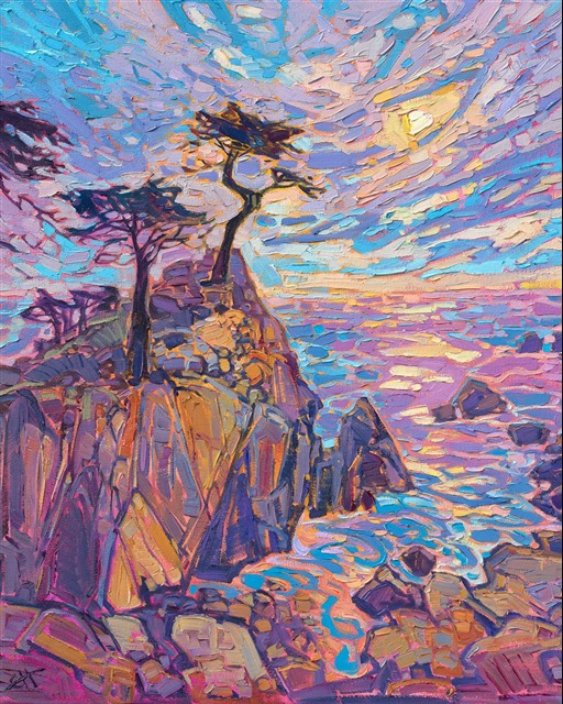 Warm colors of caramel and butter pecan drench the landscape in this sunset oil painting of Lone Cypress, on Seventeen Mile Drive in Pebble Beach. The thick, expressive brush strokes draw you into the painting, capturing the movement of light and air.