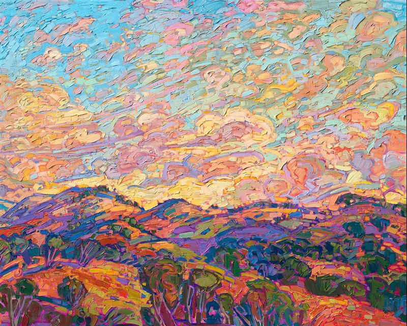 Style: "Open Impressionism" is a new style of painting developed by American artist Erin Hanson. The style is characterized by short, impasto brush strokes that are applied without layering, creating a mosaic or stained-glass appearance to the paintings. The paintings are created with a limited palette of colors, applied without blending or mixing upon the canvas, which adds a dimension of texture to each brush stroke. Inspired by classic impressionism, pointillism, and post-impressionism, Erin Hanson continues the tradition of impressionism into the modern day with her colorful and vivacious landscape paintings.