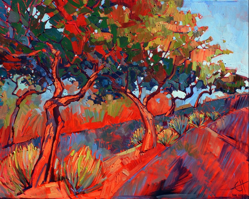 ERIN HANSON has been painting in oils since she was 8 years old. As a teenager, she apprenticed at a mural studio where she worked on 40-foot-long paintings while selling art commissions on the side. After being told it was too hard to make a living as an artist, she got her degree in Bioengineering from UC Berkeley. Afterward, Erin became a rock climber at Red Rock Canyon, Nevada. Inspired by the colorful scenery she was climbing, she decided to return to her love of painting and create one new painting every week.