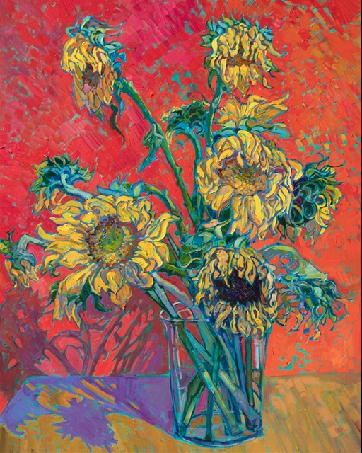 Colorful sunflowers create abstract patterns against a red backdrop. Thick, impasto paint strokes give the painting additional depth and motion. This painting is a rare example of an Erin Hanson still life, from her iconic Sunflower Series.