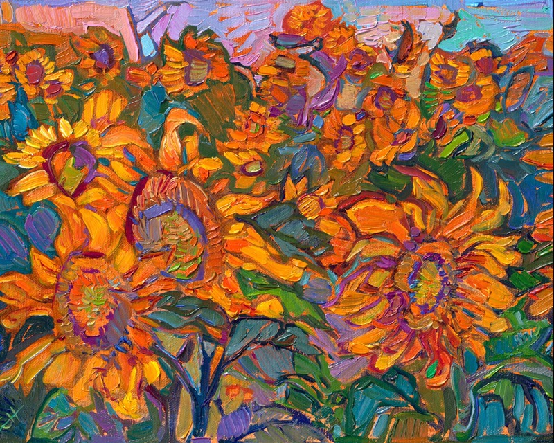 The golden hour in Provence, France, is worth waking up at 5 AM to see. The high plateaus became saturated in glowing orange light, and when I saw this field of sunflowers, I spent the entire golden hour walking among the sunflower stalks and taking hundreds of reference photos. This painting captures the magical light from that morning.