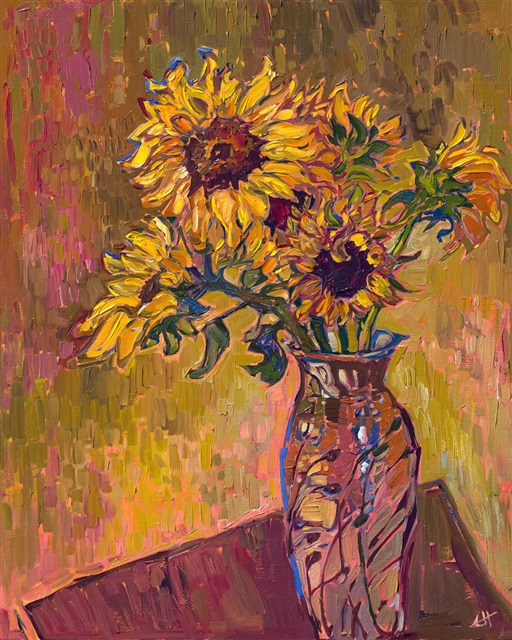 A tall vase of cut sunflowers gleams with subtle color variations against a painted wall. The brushstrokes are thickly applied and alive with texture. Erin's contemporary impressionism paintings of sunflowers were originally inspired by the sunflower paintings of van Gogh. Erin's modern take on impressionism is called Open Impressionism, a style now taught in art schools worldwide.