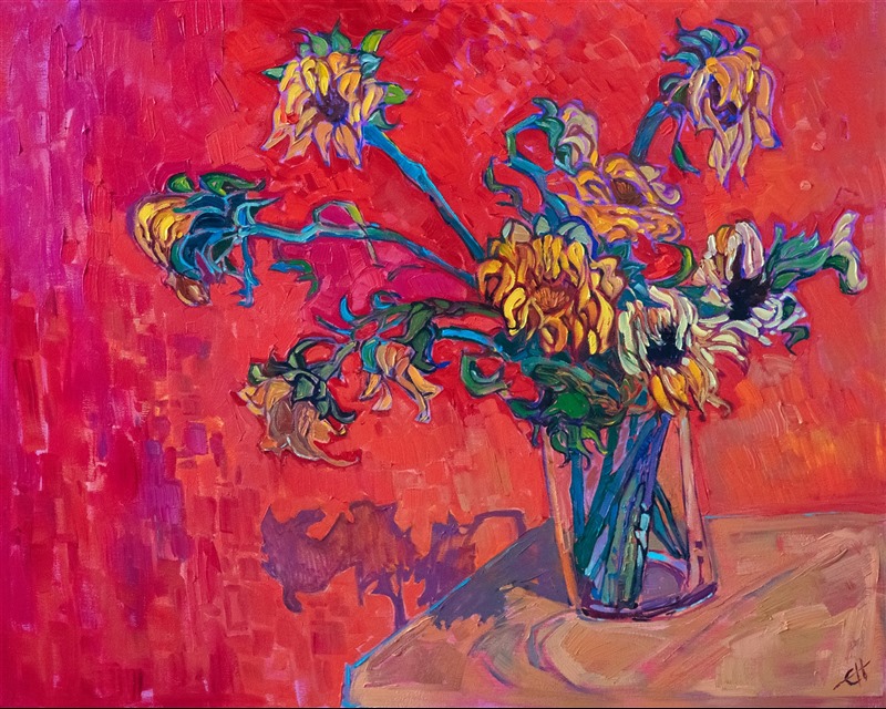A glass bowl of sunflowers catches the light in this Van Gogh-inspired oil painting. The brisk red backdrop acts as the perfect contrast to the brilliant colors of the stems and flowers.