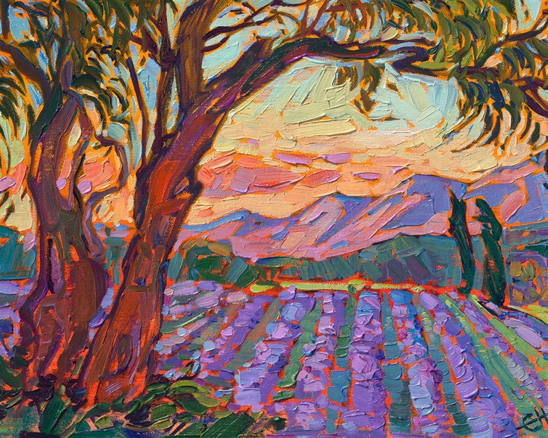 Style: "Open Impressionism" is a new style of painting developed by American artist Erin Hanson. The style is characterized by short, impasto brush strokes that are applied without layering, creating a mosaic or stained-glass appearance to the paintings. The paintings are created with a limited palette of colors, applied without blending or mixing upon the canvas, which adds a dimension of texture to each brush stroke. Inspired by classic impressionism, pointillism, and post-impressionism, Erin Hanson continues the tradition of impressionism into the modern day with her colorful and vivacious landscape paintings.