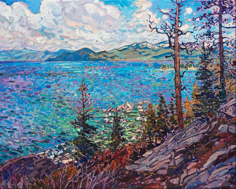 Lake Tahoe is all about the color blue... I have never seen so many shades of blue in a body of water before. Tahoe is truly the Caribbean of the Sierras. This painting captures all the beauty of a summer morning spent gazing across the lake to the snow-topped mountains in the distance.